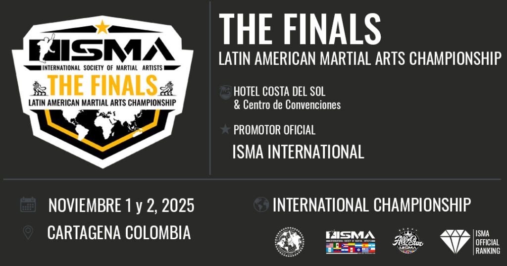Nos complace anunciarles que la GRAND FINALS ISMA se llevará a cabo en las playas paradisíacas de Cartagena, Colombia. Este evento reúne a los mejores talentos de Sport Karate de toda Latinoamérica, brindándoles una plataforma para demostrar su destreza y competir al más alto nivel, la invitación es para todos los competidores que participen en uno de los eventos avalados por la International Society of Martial Artists, pueden participar todos los grados y todas las edades.